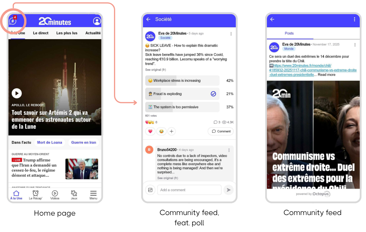 20 Minutes, France's most-read free daily media with 16M+ monthly users, integrated the Octopus Community native SDK. It turned a news consumption app into an interactive social platform where readers debate, vote, and engage daily.