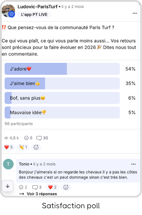 Four months after launch, Paris Turf Live ran a satisfaction poll directly inside the community — asking users, in context, whether they were satisfied with the feature. 89% said yes. Beyond the number, the poll opened a qualitative feedback loop: users shared what they loved, what they wanted next, and how the community fit into their race-day routine. For a product team, this kind of signal — captured in-app, at the moment of use, by the users most engaged with the product — is more actionable than any post-session survey.